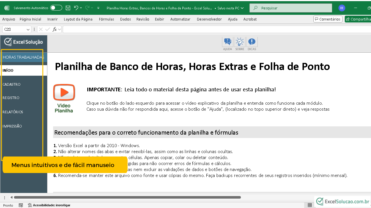 Confira um resumo dos recursos e funcionalidades desta Planilha