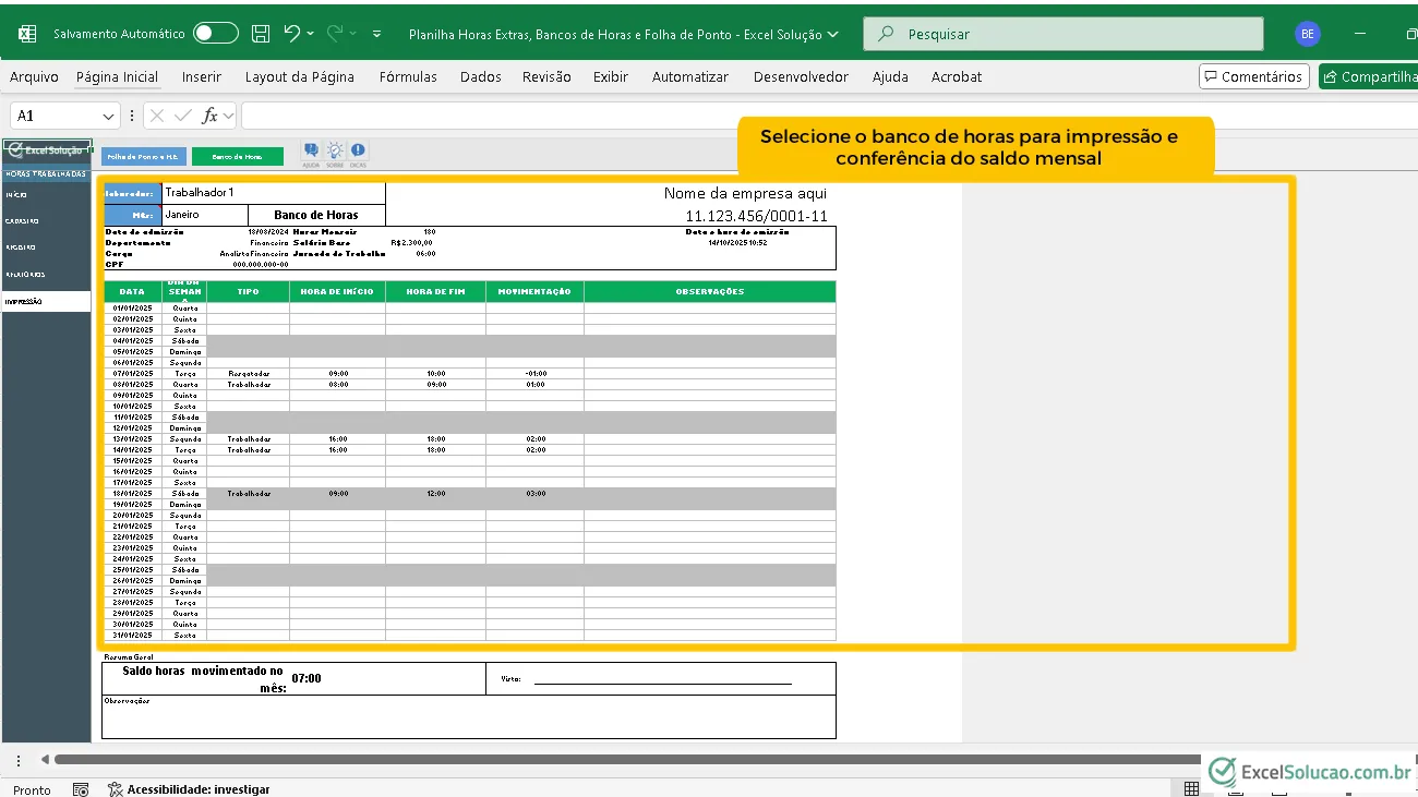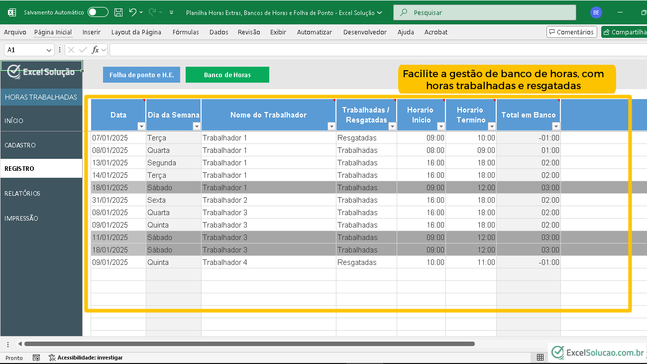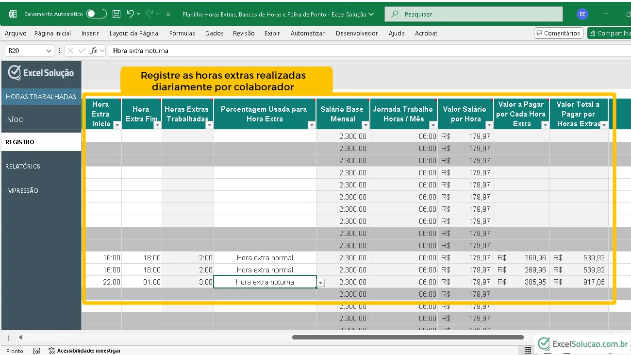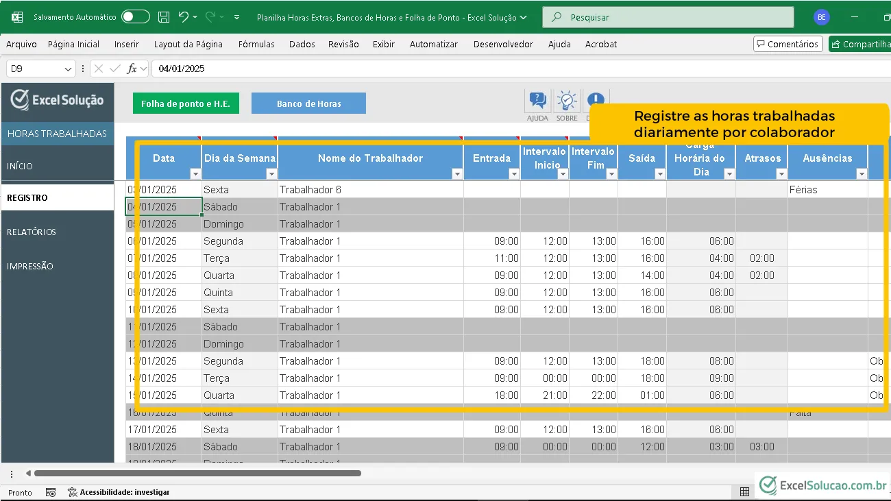 Para monitorar a jornada de trabalho e calcular o valor devido em horas extras é preciso alimentar diariamente a planilha com as informações de horário de entrada e saída do funcionário. A partir desses lançamentos, a planilha calcula de forma inteligente e exibe o total de horas trabalhadas, horas devidas e horas extras.