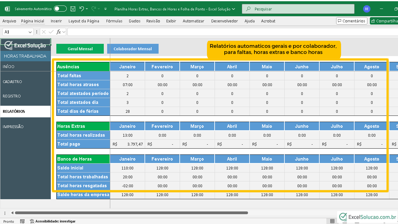 Na última seção da planilha estão os resultados consolidados da apuração de horas extras. Veja na tabela, mês a mês, o relatório das horas trabalhadas, horas devidas, horas extras e a diferença de horas acumuladas entre o começo e o fim do período.