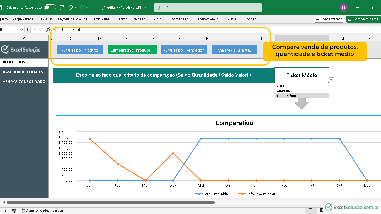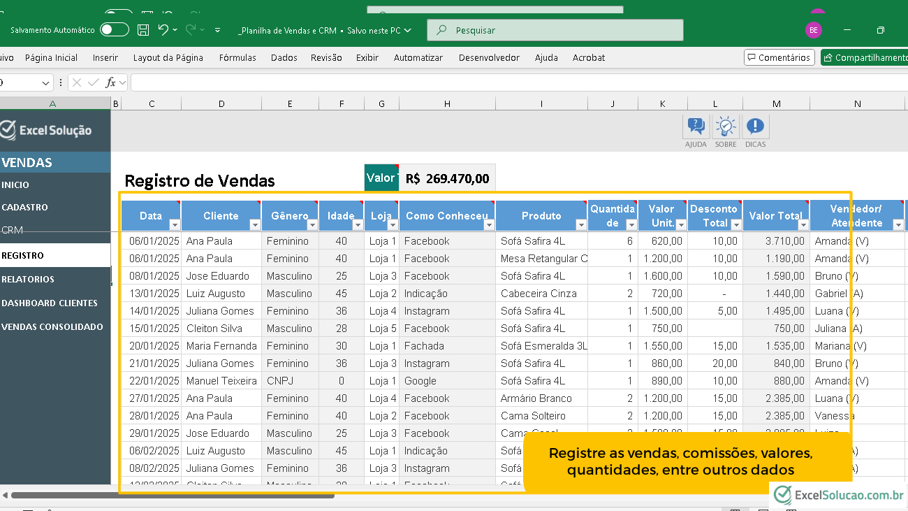 Utilize esta ferramenta para identificar os produtos de maior saída, os canais que mais contribuem com as vendas e os clientes mais importantes. Também calcule com facilidade a receita gerada pelas vendas e a comissão devida para cada vendedor.