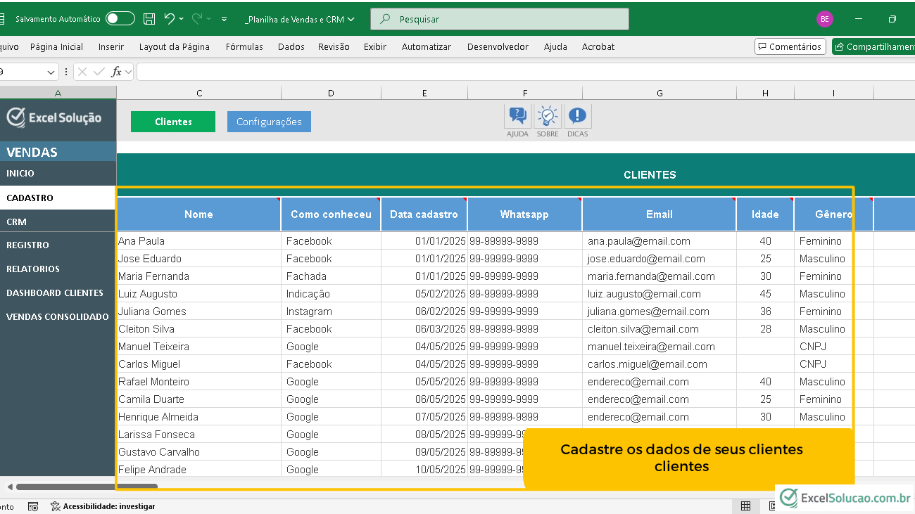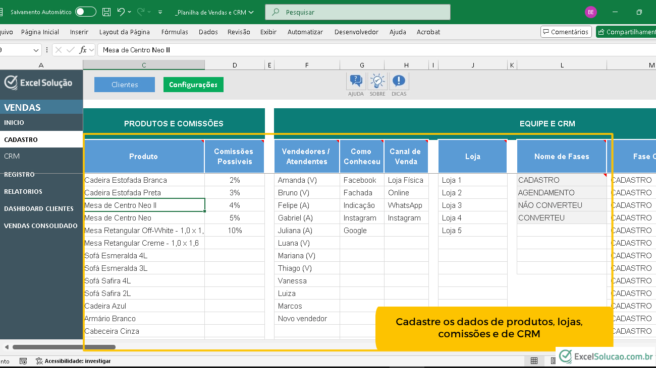 Manter o cadastro completo e organizado é essencial para aproveitar toda a praticidade que a planilha de vendas em Excel oferece, evitando retrabalhos e digitações repetitivas. Comece cadastrando todos os produtos que estão no catálogo de sua empresa, com nome e preço unitário, além de nome de vendedores, atendentes, lojas e clientes.